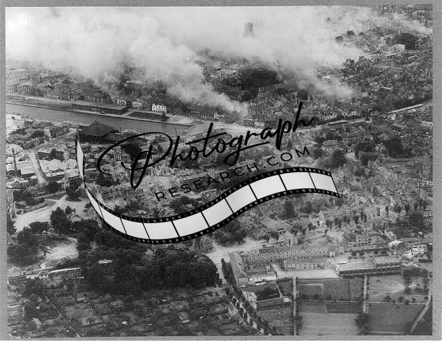 Aerial,Bomb Damage,Caen,France,burning on D-Day,June 7,1944,WWII,bombardment