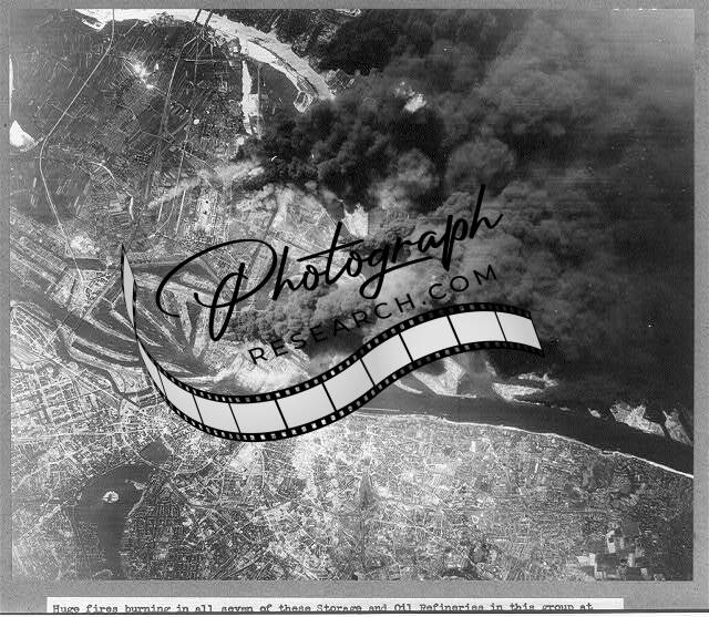 Aerial,Bomb Damage,Huge fires burning,oil refineries,Hamburg,June 20,1944,WWII