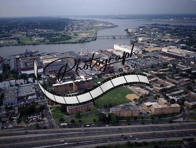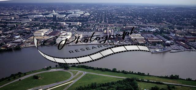 Title: Aerial view with a focus on plants and other buildings along the Potomac River, Washington, D.C.