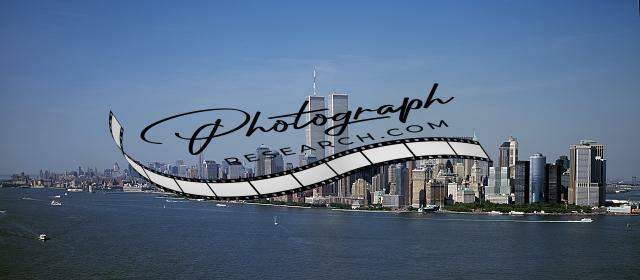 Title: Aerial view of New York City, in which the World Trade Center Twin Towers is prominent