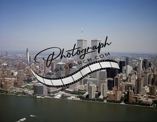 Title: Aerial view of New York City, in which the World Trade Center Twin Towers is prominent