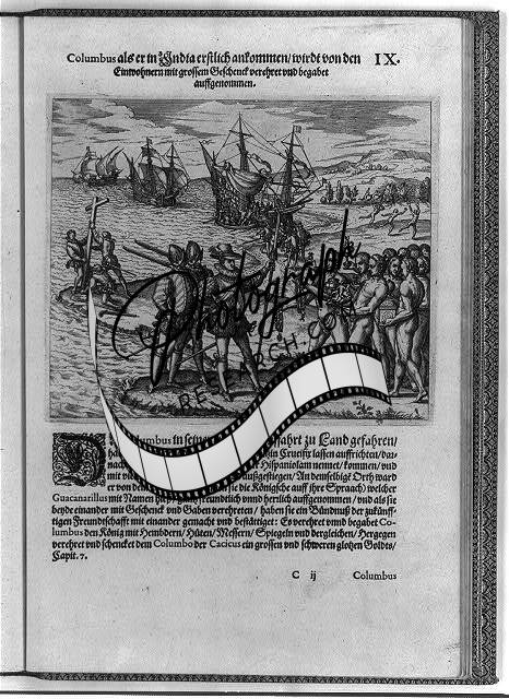 Christopher Columbus landing on Hispaniola,greeted by Arawak Indians,1492