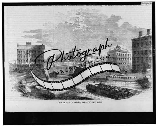 View of Salina Street,Syracuse,New York,NY,Bridge,Barge,Man on Horseback,1858