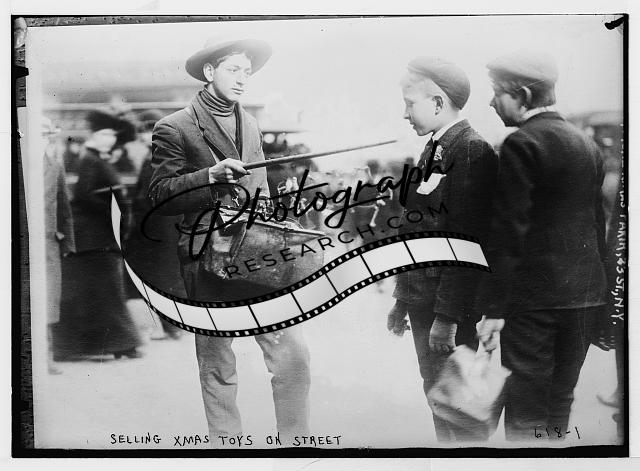 Street vendor showing Christmas toys to boys 23rd Street,New York,NY,1908