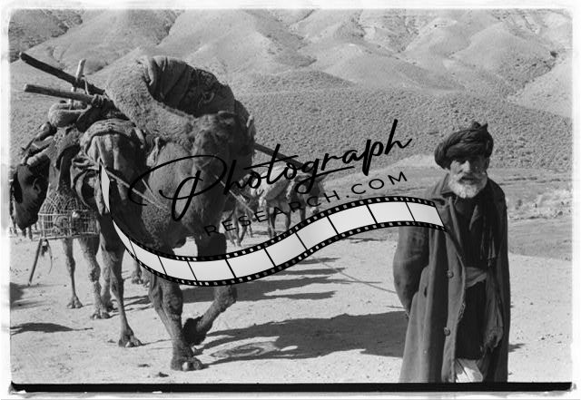 Afghan man leading laden camels and donkeys through an arid, rocky landscape
