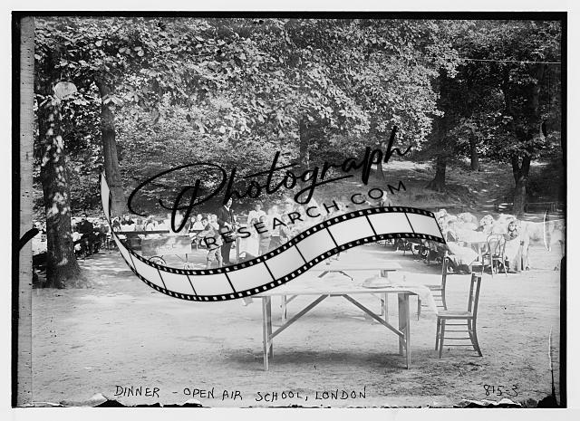 Children at tables on lawn,dinner at London Open-air School,table,chairs