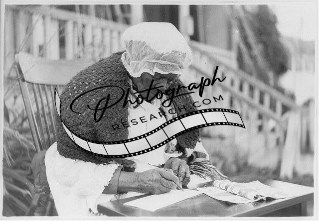 Mammy Prater,115 year old ex-slave; half,writing at table,c1920,bonnet,shawl