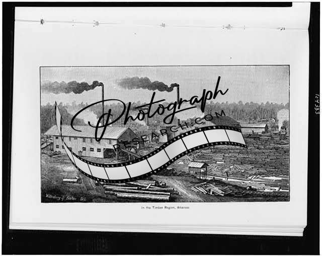 Timber region,lumber industry,trees,buildings,smokestacks,logs,Arkansas,AR,c1896