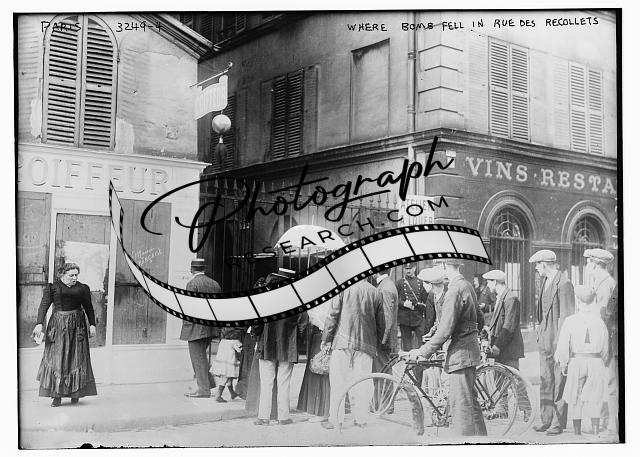 Where bomb fell in Rue Des Recollets,people gathered,umbrella,bicycle,child