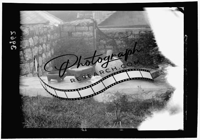 Title: Agriculture, etc. Primitive methods of rubbing and grinding wheat. Woman grinding with present-day hand mill. Before her modest home on southern Sharon