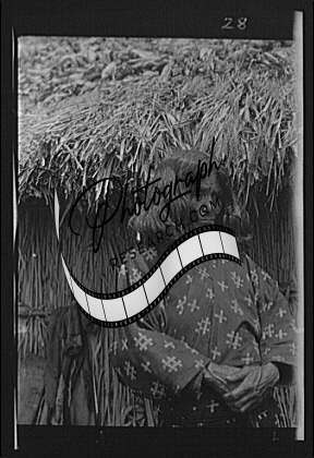 Ainu woman outside hut,villages,thatched structures,roofs,Arnold Genthe,1908