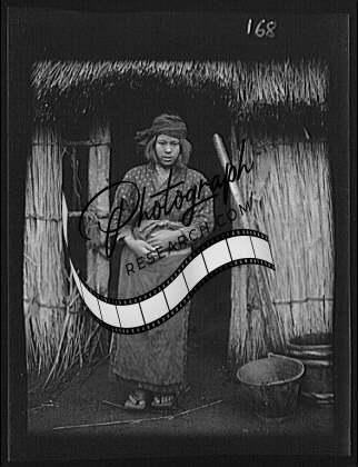 Ainu woman,villages,nitrates,doorway,hut,thatched buildings,Arnold Genthe,1908