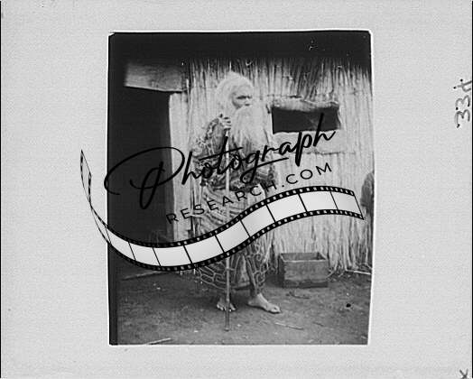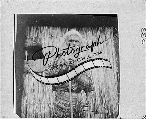 Ainu man holding staff,doorway,hut,structures,villages,Arnold Genthe,1908