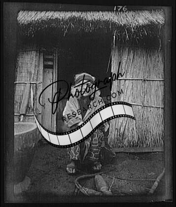 Ainu woman front,doorway,hut,villages,thatched buildings,Arnold Genthe,1908
