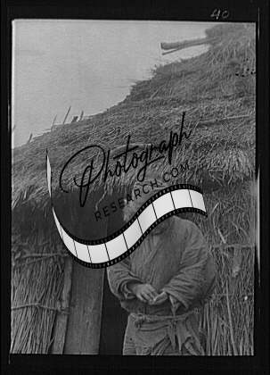 Ainu woman outside hut,thatched buildings,structures,villages,Arnold Genthe,1908