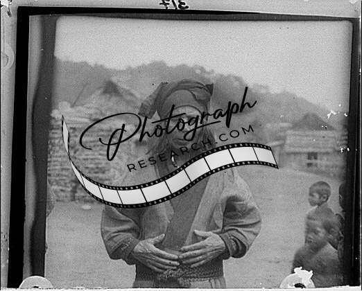 Ainu woman outside,middle,village,people,cities,lantern slide,Arnold Genthe,1908
