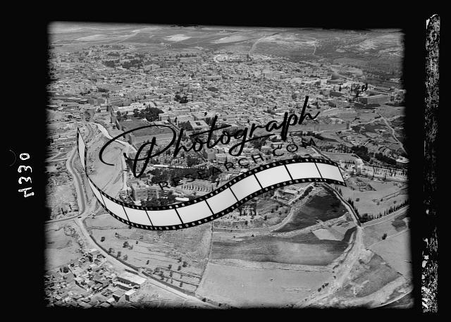 Title: Air views of Palestine. Jerusalem from the air (the Old City). Herod's Gate quarter. Closer view showing vacant areas within the walls