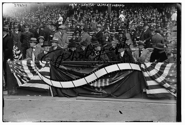 Original data provided by the Bain News Service on the negatives or caption cards: Lasker, Ruppert & Harding at Yankee Stadium, 4/24/23.