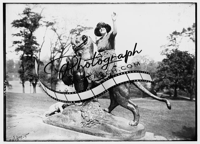 Alda,statues,women riding animal sculptures,outdoors,cats,Bain News Service