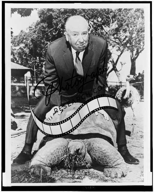 Alfred Hitchcock rides turtle,Sydney,Australia 1960