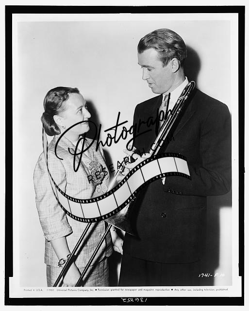 Mrs. Glenn Miller, James Stewart, with the trombone which her husband actually played prior to his untimely death during World War II