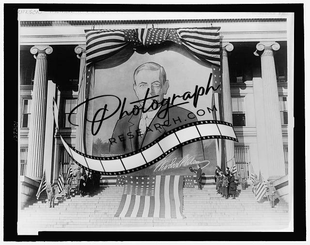 Banner-size painting of President Woodrow Wilson hanging from a building,c1920