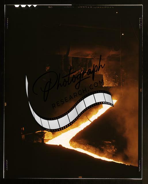 Title: Ladle of molten iron is poured into an open hearth furnace for conversion into steel, Allegheny Ludlum Steel[e] Corp., Brackenridge, Pa. Note the safety latch on the crane hook