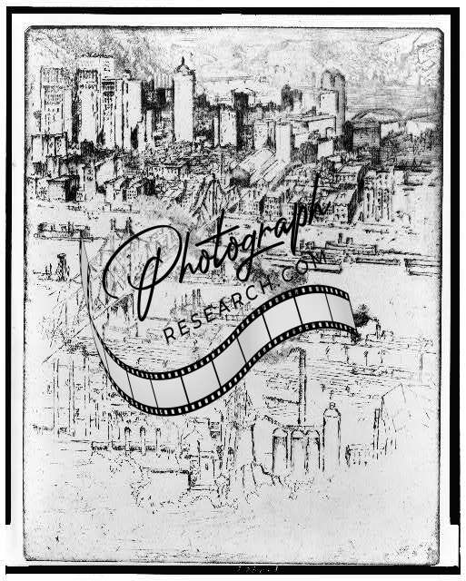 Railway Station,Pittsburgh,Pennsylvania,PA,1909,Boats,Skyline,Joseph Pennell