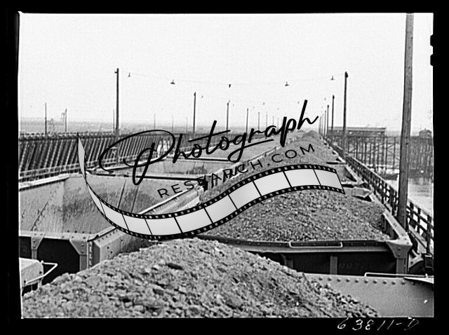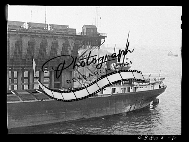 Title: Loading iron ore into hold of boat. First mate directing operations. Allouez, Wisconsin