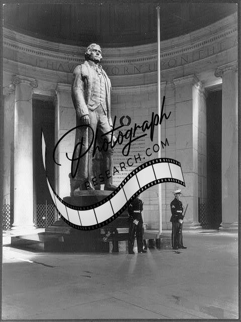 Jefferson Memorial Statue guarded by 2 Marines during memorial dedication,1943
