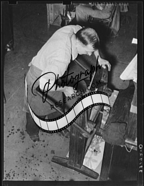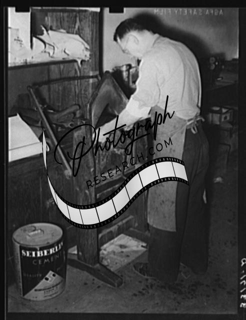 Title: Placing pieces of leather into crimping machine to shape the lowers of the boots. Boot shop, Alpine, Texas