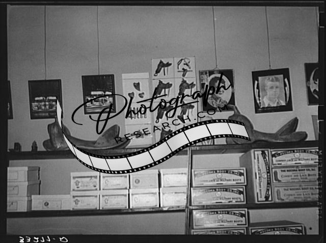 Title: Cowboy looking at display of spurs. Ranch supply store, Alpine, Texas