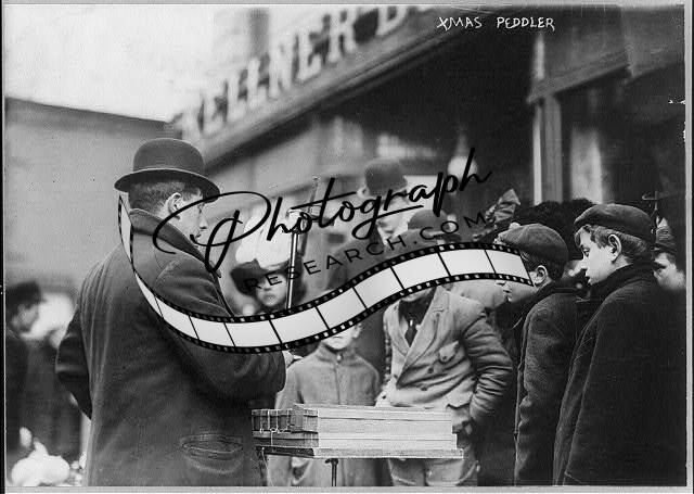 Christmas peddler,man displaying object to people on street,New York City,NYC