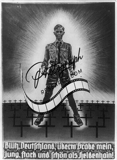 Symbolic figure of Hitler Youth standing defiantly amid mass of grave markers
