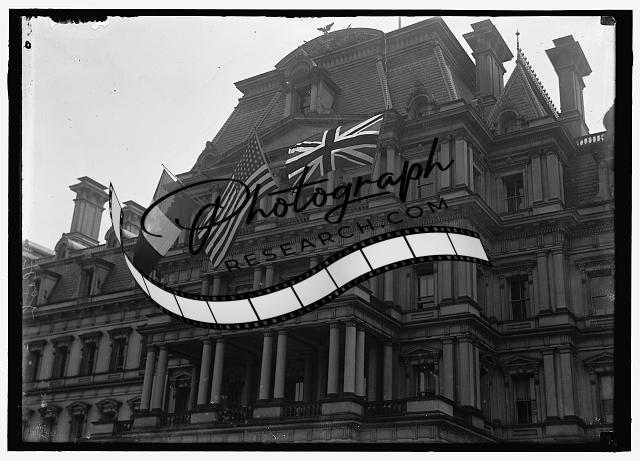 Title: FLAGS. AMERICAN, BRITISH, AND FRENCH FLAGS IN FRONT OF UNION STATION, AWAITING ARRIVAL OF BALFOUR AND ALLIED COMMISSION
