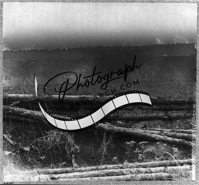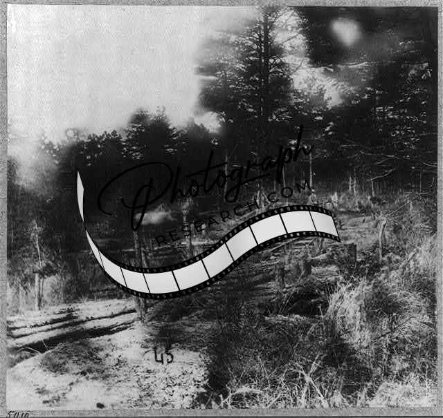 Title: Battlefield of the 'Wilderness'. Palmer's field, on Orange Turnpike - Confederate entrenchments at edge of woods