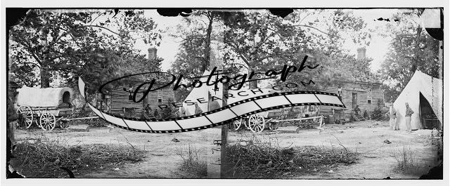Caption from negative sleeve: Rear view of old Frame House, Orchard and well at Seven Pines. Over 400 soldiers were buried here after the Battle of Fair Oaks. June 1862.