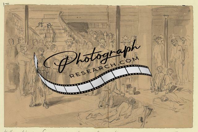 Inscribed below title: The figures on the right are coming in with the new clothing, in the centre pitching the old rags overboard, & going out on the left to get their rations. See New York Times.