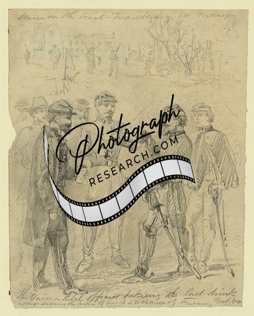 Inscribed below image in black ink, with numbers matching those on figures as identifiers: Major Stuart Van Vliet, No 1; Genl Sykes, 2; Secretary of War Stanton 3; Major Gen McLellan[sic]4 ; Genl D.E. Sickels, 5; Gen McDowau 6; Adjuten[sic]Gen Thomas F; Gen Seth Williams 8; Genl Stoneman 9.