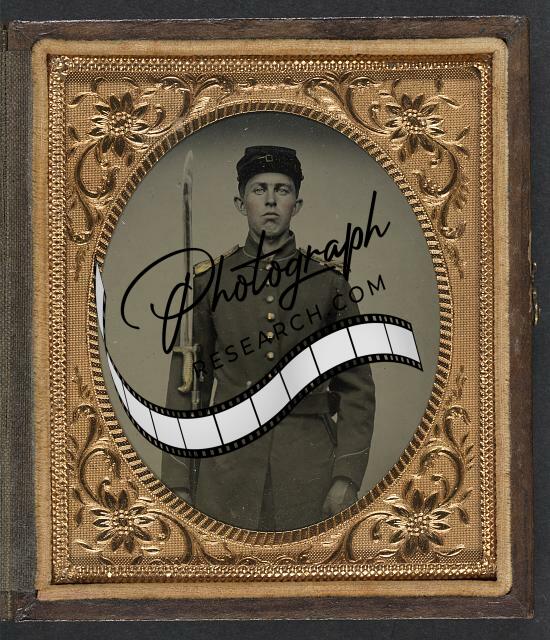 Title: [Unidentified soldier in Union uniform with carbine in front of painted backdrop showing military camp scene]