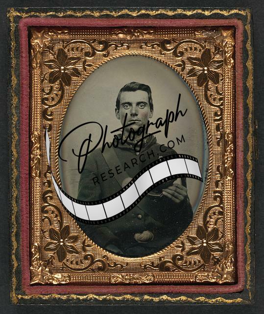 Title: [Unidentified soldier in Union corporal's uniform with 1858 Army hat of Company H, 4th Infantry Regiment in front of painted backdrop showing outdoor scene]