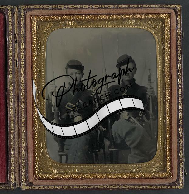 Title: [Two unidentified soldiers, possibly father and son, in Union uniforms with 20th regiment insignias on their kepis]