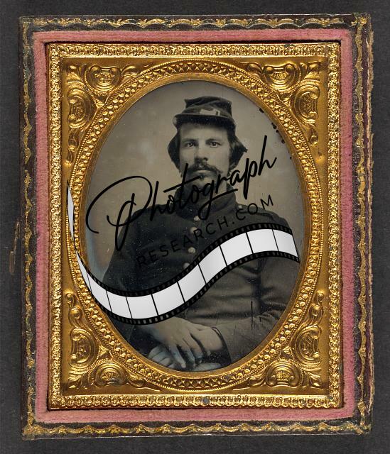 Title: [Unidentified soldier in Union uniform and forage cap with insignia of Company A, 124th Regiment W.K., holding revolver]