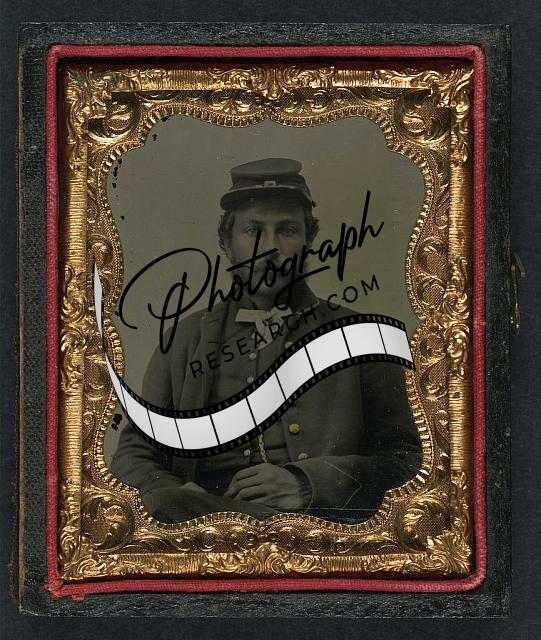 Title: [Unidentified soldier in Union uniform with 6th Corps badge in front of painted backdrop showing landscape]