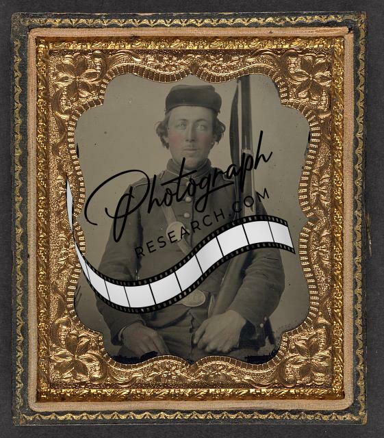 Title: [Unidentified soldier in Union uniform with musket, bayonet in scabbard, revolver, and cap box in front of painted backdrop showing military camp scene]