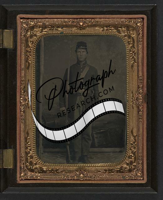Title: [Unidentified young soldier in Union frock coat and forage cap with bayonet scabbard, cartridge pouch, ammunition box, and bayoneted musket]