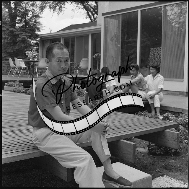[[Architect Minoru Yamasaki relaxing outside at home, Troy, Michigan]]