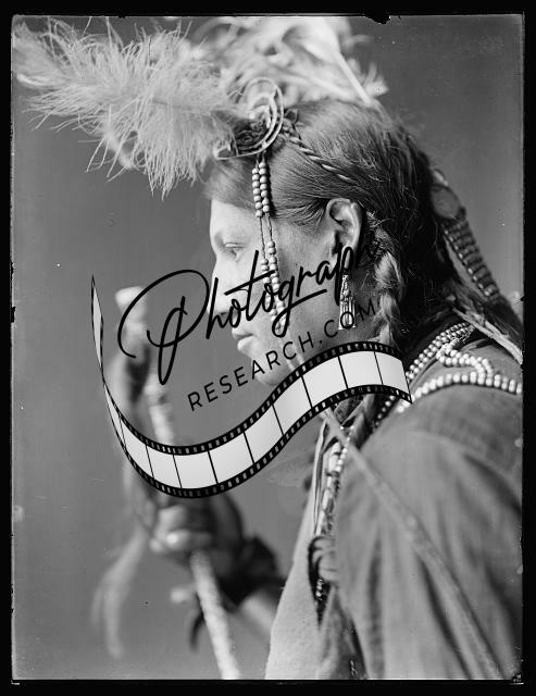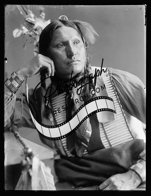 Summary: American Indian man, member of Buffalo Bill's Wild West Show, seated, facing left, wearing star-shaped badge reading: Buffalo Bill's Wild West Co. Police.
