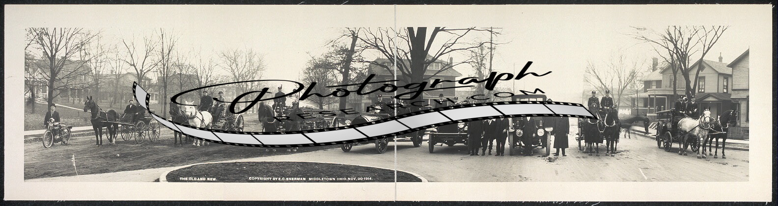 1914 Panoramic: The old,new Fire Engines, Middletown, Ohio