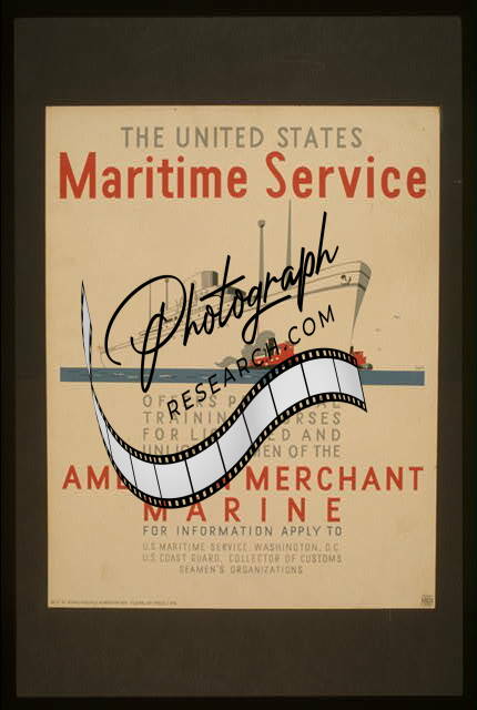 Caption continues: For information apply to: U.S. Maritime Service, Washington, D.C., Coast Guard, Collector of Customs, and Seamens organizations.